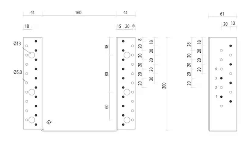 - Anzahl Löcher D 5 mm Nebenträger nJ + Hauptträger nH: 26+42 STK