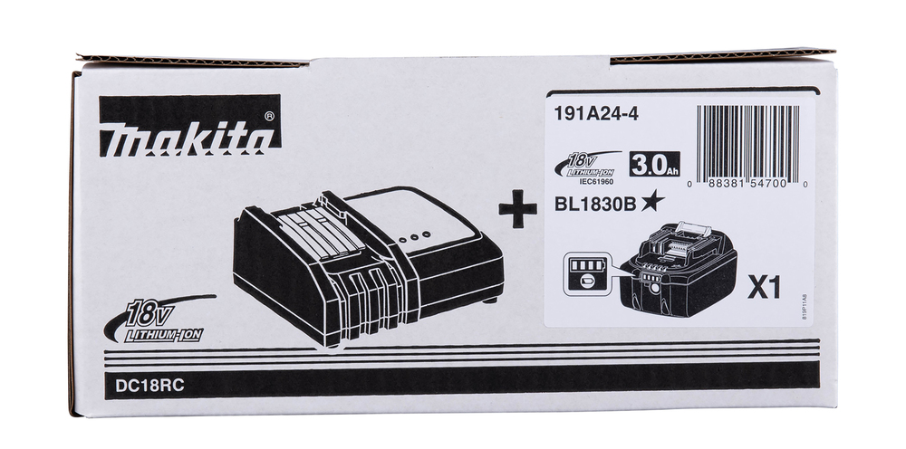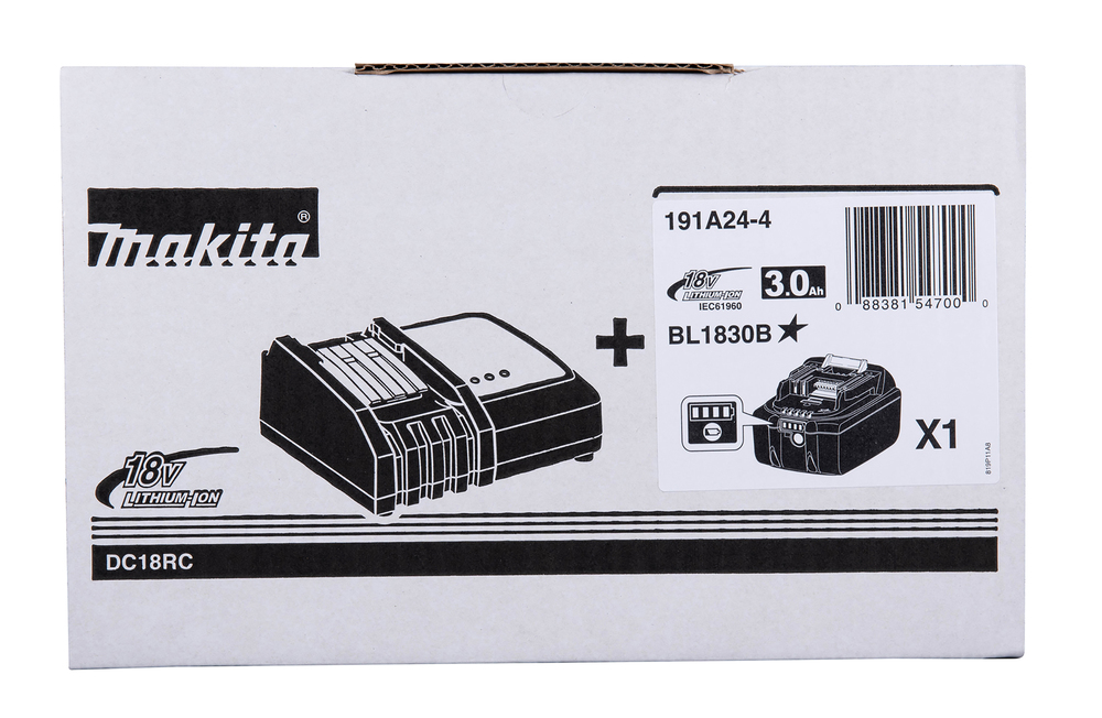 Power Source-Kit bestehend aus 1x Akku BL1830B 3,0 Ah und 1 Schnellladegerät DC18RC. Lieferung im Karton.