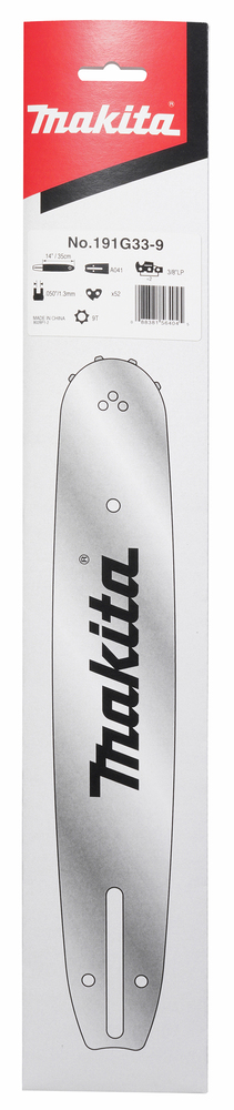 Die 35 cm lange Sägeschiene verfügt über einen vernieteten 9-zackigen Umlenkstern an der Spitze. Die Schienennutbreite beträgt 1,3 mm und ist für Ketten mit einer Teilung von 3/8" geeignet. Für Kettensägen mit A041 Aufnahme