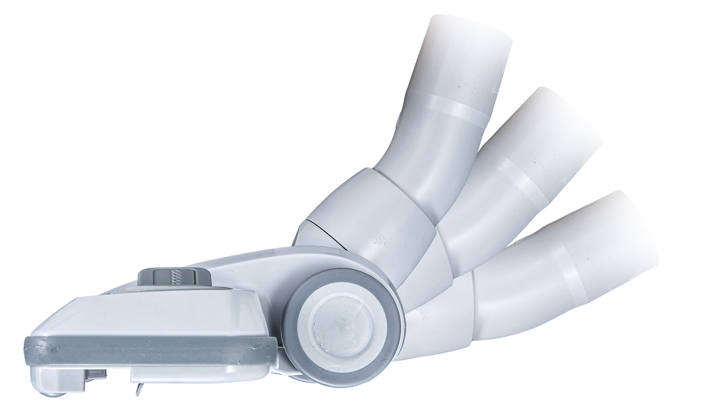 Bodendüse für Hartböden und Teppichböden. Durch zwei kleine und zwei große Laufräder fährt die Düse leicht über die zu reinigende Fläche. Die Bodendüse ist zudem mit einem von rechts nach links durchgehenden Stoßschutz versehen. Durch die zuschaltbare Teppichbürste lassen sich ebenso Teppichböden mühelos absaugen. Durch das verbesserte Kopfgelenk lässt sich die Düse besser neigen und vereinfacht das Arbeiten unter dem Sofa oder dem Bett.