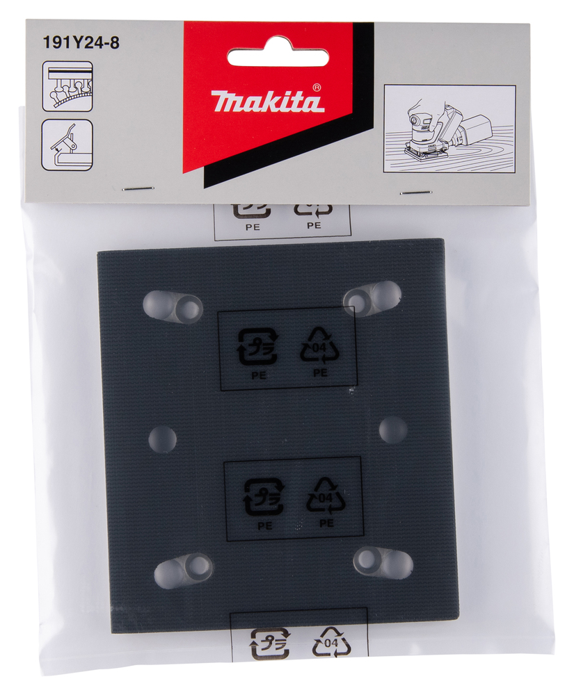 Die quadratische Grundplatte mit Klettvorrichtung für die Akku-Schwingschleifer DBO480 und DBO484 eignet sich für die Verwendung von aufklettbarem Schleifpapier.