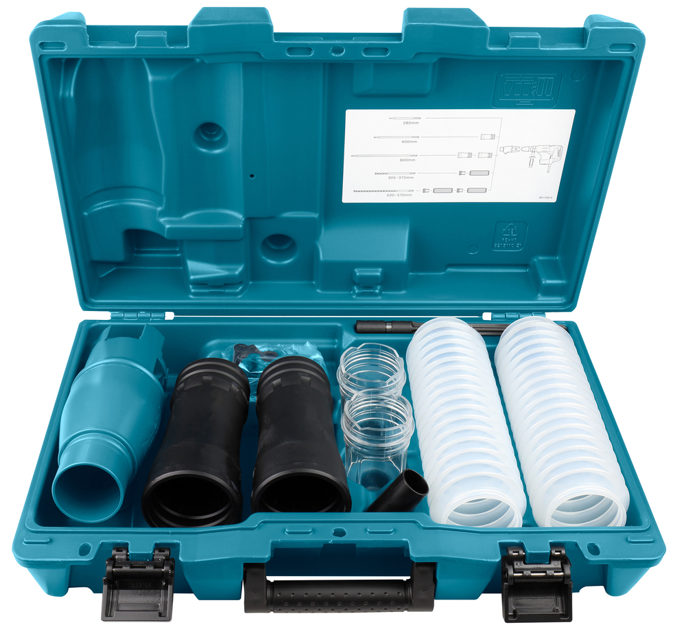 Das Absaugset ist werkzeuglos montierbar und kommt in einem praktischen Koffer. Für Meißel mit einer Länge bis max. 600 mm sowie Bohrer bis max. 570 mm. Der Saugschlauch kann mittels einem Clip am Stromkabel des Kombihammers befestigt werden. Inklusive zwei Faltenbälge und zwei Staubfangverlängerungen.