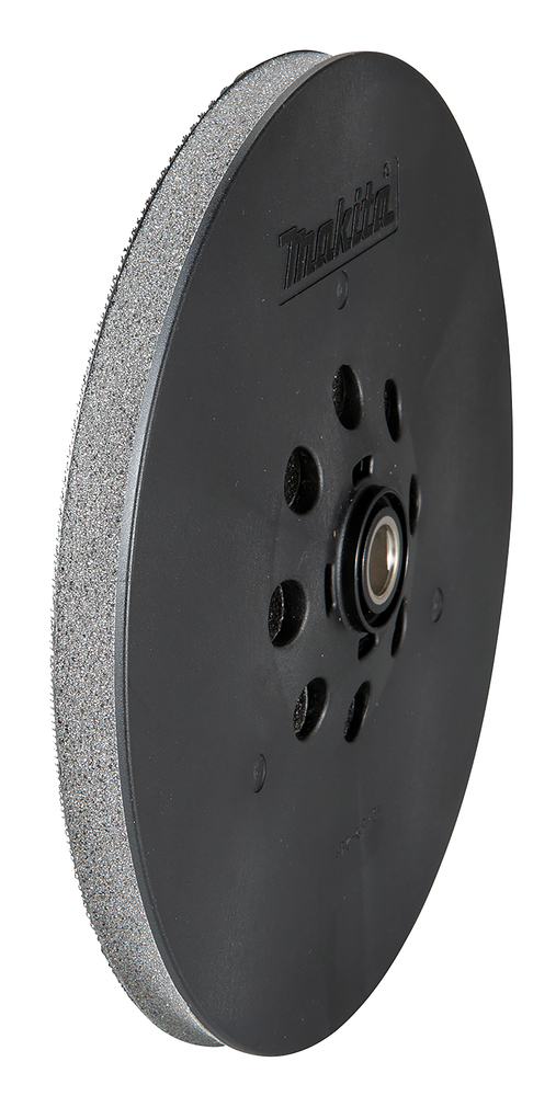 Schleifteller mit 210 mm Ø. Das Schleifpapier wird sicher mittels Klett auf dem Schleifteller befestigt. Die 8 im Kreis gebohrten Löcher dienen der effektiven Staubabsaugung über den Akku-Langhalsschleifer.