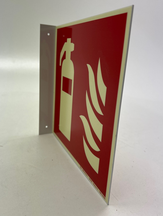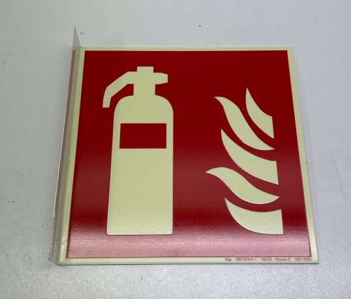 Auf dem roten Schild ist links ein weißer Feuerlöscher zu sehen. Rechts davon sind in weiß Flammen dargestellt. Langnachleuchtende Schilder können außerdem bei starker Verrauchung und Stromausfällen noch besser erkannt werden.