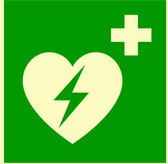 Mittig auf dem grünen Schild ist ein weißes Herz zu sehen. In dem Herzen ist ein Blitzpfeil abgebildet. Rechts oben in der Ecke befindet sich das Rettungszeichen Erste Hilfe nach DIN EN ISO 7010.