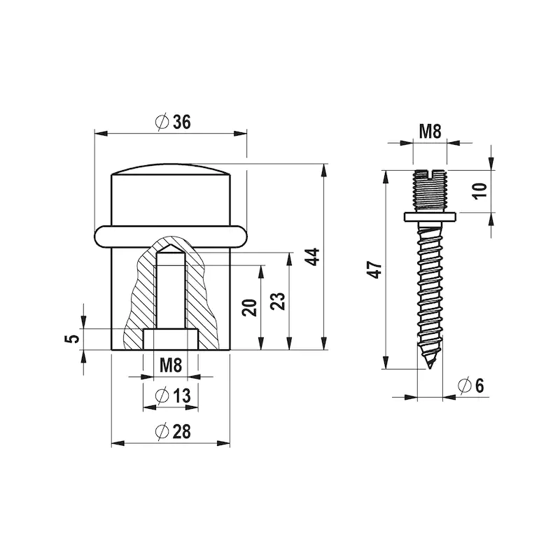 - Lieferumfang: 1 Türstopper, 1 Nylondübel Ø 8 mm, 1 spezielle Stockschraube 6 x 47 mm mit M 8 Gewinde