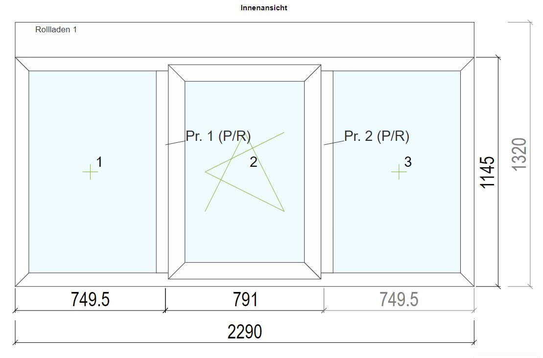 - Beschlag: Fest im Rahmen (Feld 1, 3) Dreh-Kipp rechts (Feld 2)