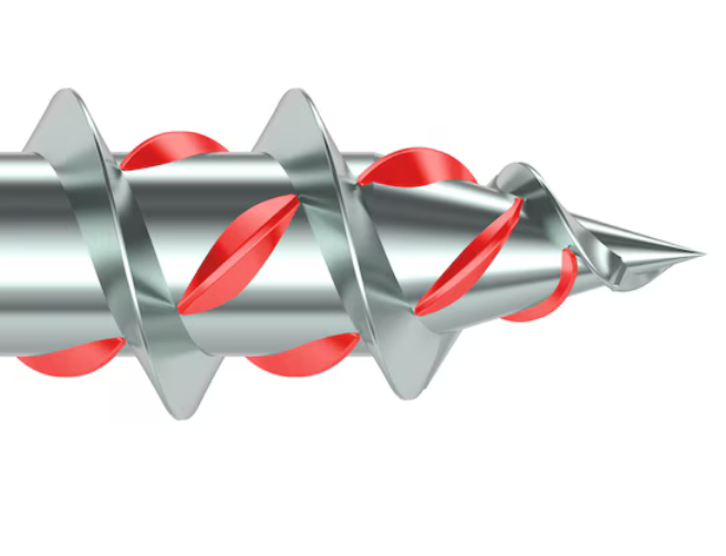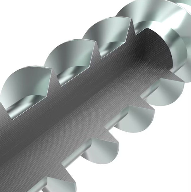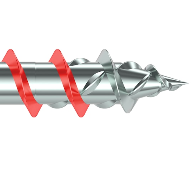 - Höhere Kraftübertragung in Harthölzern aufgrund verstärkter, asymmetrischer Gewindeflankengeometrie des Grobganggewinde