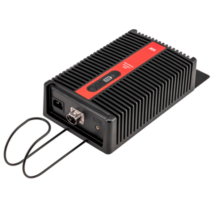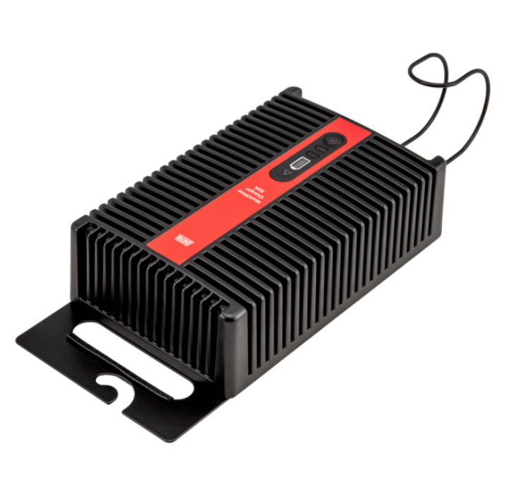 Kompaktes, robustes Batterieladegerät mit schmutzunempfindlichem Aluminiumgehäuse, Kabelhalterung an der Unterseite