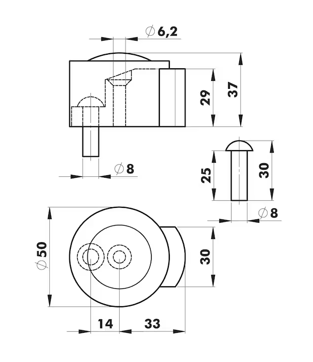 - Lieferumfang: 1x Türstopper inkl. Abdeckung, 1x Linsensenkkopfschraube 5,5 x 70 mm, 1x Sicherungsstift, 1x Nylon Dübel 8 mm