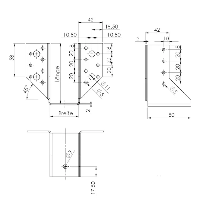Universeller einteiliger Standardbalkenschuh (außen abgewinkelt) für tragende Verbindungen von Holzträgern mit Standardquerschnitten an Holz, Beton oder Stahl.