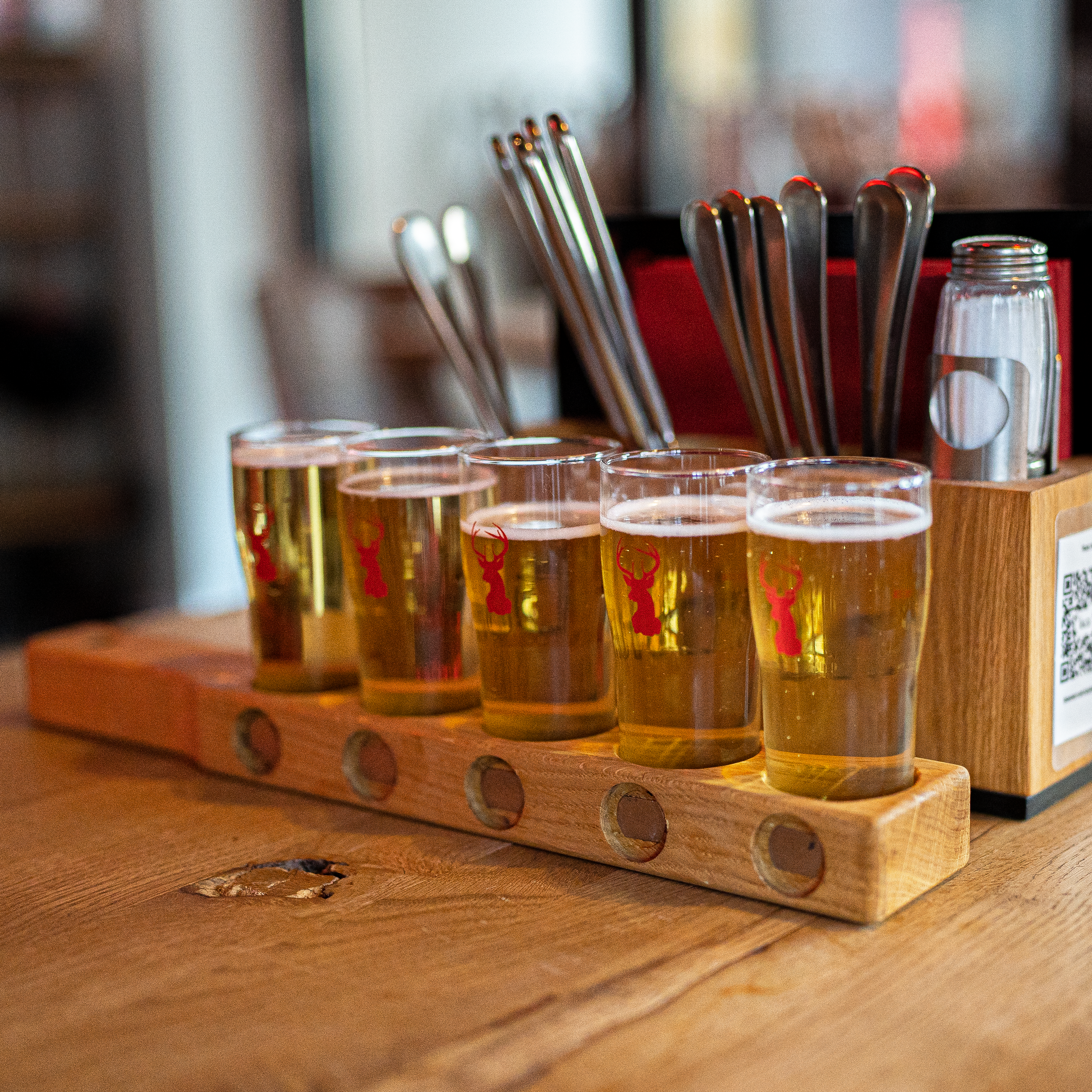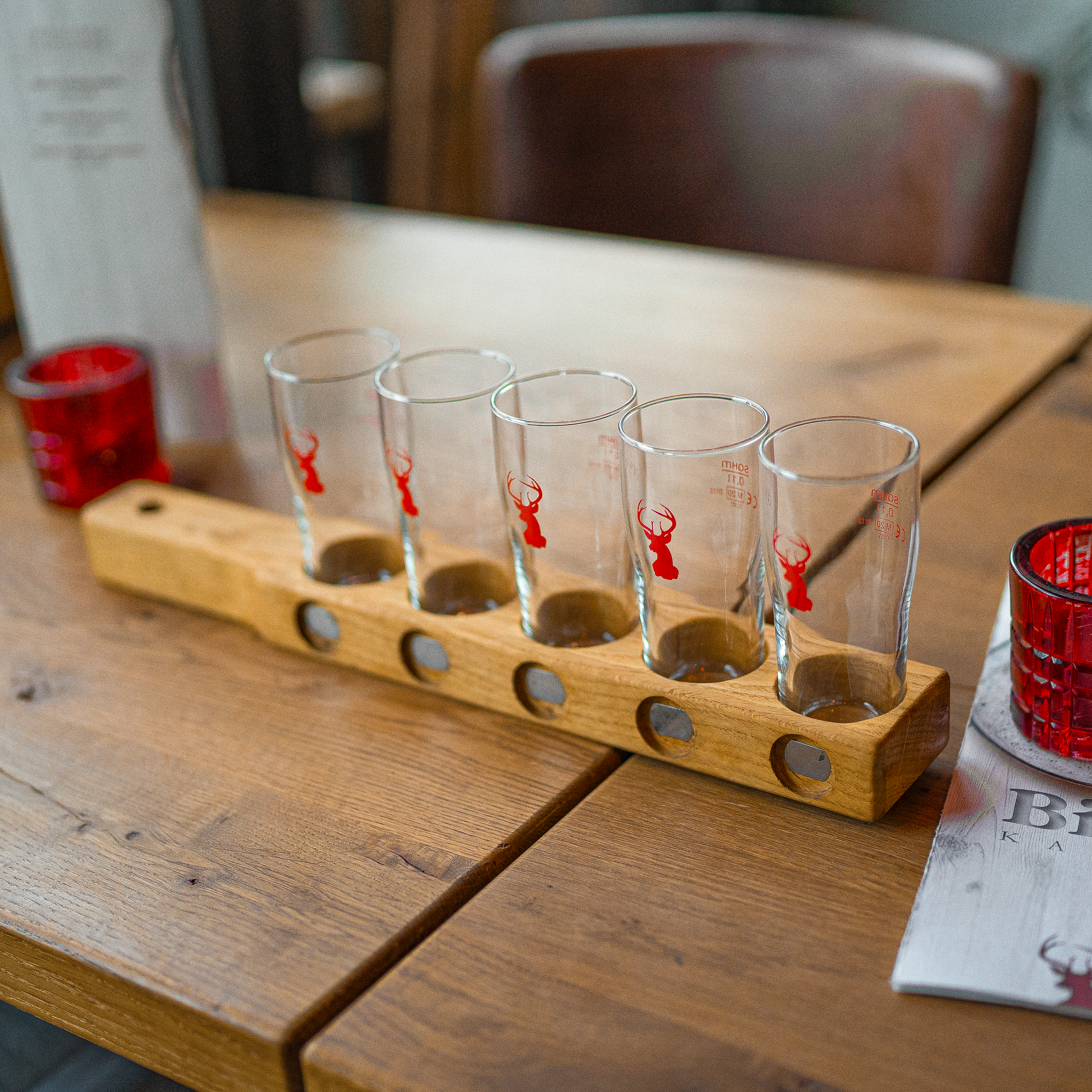 ... mit dem stilvollen Holzbrett ganz einfach 5 Gläser gleichzeitig servieren.