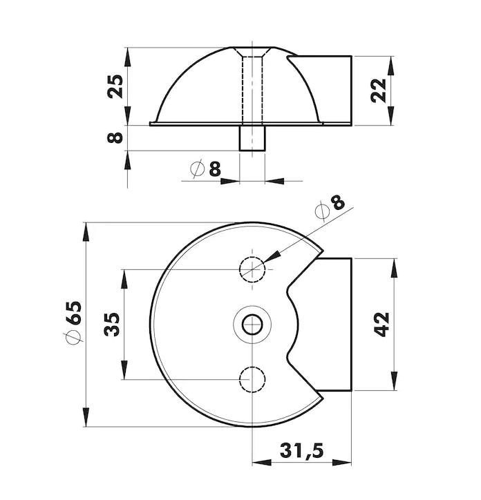 ... 3-Punkt-Befestigung mittels einer Schraube (sichtbar) und zwei einvulkanisierten Sicherungsbolzen Ø 8 mm