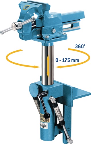 mit Gasdruckfedern und Sicherheitsspannhebel · ermöglicht stufenlose Höhenverstellung des Schraubstocks um 175 mm und Drehung um 360° · bei Nicht-Gebrauch kann der Schraubstock einfach unter die Werkbank geklappt werden, somit steht die gesamte Arbeitsfläche für andere Tätigkeiten zur Verfügung · Made in Germany