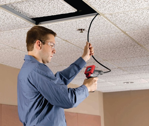 ideal für schwer zugängliche Stellen · äußerst leichte und kompakte Bauweise · die Kamera eignet sich unter anderem für die Inspektion schwer zugänglicher Stellen · das Gerät ist mit einem halbflexiblen Kabel mit einem Aluminium-Kamerakopf ausgestattet, der Bilder an einen LCD-Bildschirm übermittelt · Display und Bedienfeld sind in einem Komfortgriff integriert · mit Anschluss "Videoausgang" · 180° digitale Bilddrehung