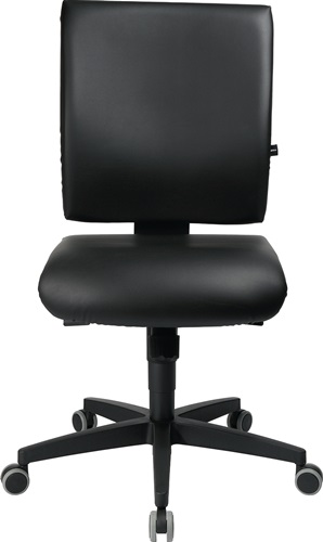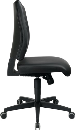 Sitz und Rückenlehne aus strapazierfähigem Kunstleder · ergonomisch geformte Rückenlehne (H 480 mm) über Raster-Mechanik höhenverstellbar · bequemer Flachsitz mit Knierolle · Punktsynchron-Mechanik zur synchronen Verstellung von Sitz- und Rückenlehnenneigung, Federkraft einstellbar auf das Körpergewicht, mehrfach arretierbar · Gasfeder - Sitzhöhenverstellung · stabiles, kippsicheres Fünffuß-Kunststoff-Fußkreuz mit lastabhängig gebremsten Sicherheits-Doppelrollen für harte Böden