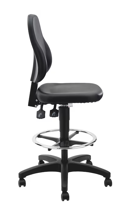 Robuster, fahrbarer Arbeitshochstuhl mit Fußring und innovativen Sitz-Stopp-Rollen für Mobilität an hohen Arbeitsplätzen.