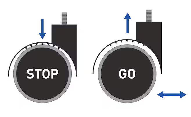 Hochstühle über 650 mm Sitzhöhe dürfen aus Sicherheitsgründen während der Nutzung nicht fahrbar sein. Mit den innovativen Sitz-Stop-Rollen erfüllen Sie diese Forderung. Bei Entlastung wird der Stuhl jedoch automatisch mobil und rollbar.