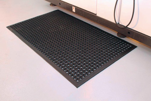 vielseitige und ökonomische Anti-Ermüdungsmatte für trockene industrielle Steharbeitsplätze · SBR-Gummi mit gelochter Oberfläche · Temperaturbeständigkeit von -20 °C bis +130 °C · Mattenstärke 10 mm · Rutschhemmung R10 nach EN 13552 · Farbe schwarz