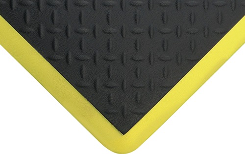 langlebige, ergonomische Arbeitsplatzmatte aus hochwertigem Polyurethan mit Rautenprofil · ideal für Arbeitsplätze mit mittlerer bis starker Belastung · geeignet für trockene Innenbereiche · abgeschrägte Mattenränder reduzieren Stolpergefahren · mit gelben Kanten für bessere Sichtbarkeit · Brandschutz geprüft nach BS EN 13501-1 · Mattenstärke 18 mm