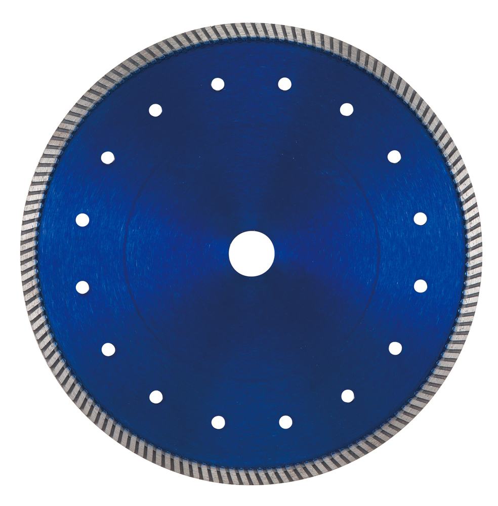 Turbo Diamanttrennscheibe mit rundherum angesetzten Einkerbungen. Gelochter Stammkern für bessere Wärme- und Staubabfuhr. Die Diamantscheibe schneidet schneller als der segmentierte Typ. Gleichzeitig kann eine sauberere Oberfläche ohne gebrochene Kanten erzielt werden.