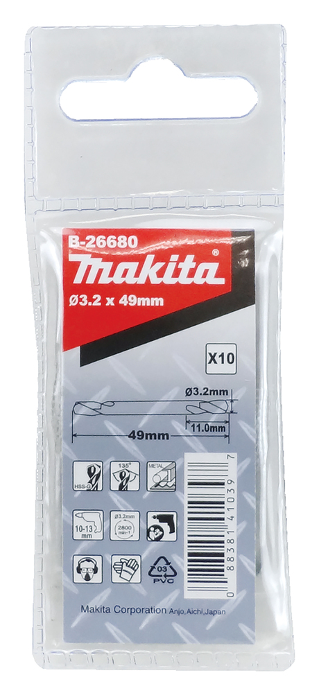 HSS Metall-Wendebohrer Ø 3,2 mm mit einer Gesamtlänge von 49 mm und einer Arbeitslänge von 11 mm. Hohe Schnittgeschwindigkeit und perfektes Zentrieren durch 135-Grad-Kreuzschliff. Die Verpackung enthält 10 Bohrer.