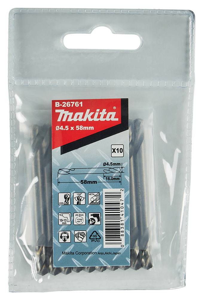HSS Metall-Wendebohrer Ø 4,5 mm mit einer Gesamtlänge von 58 mm und einer Arbeitslänge von 16 mm. Hohe Schnittgeschwindigkeit und perfektes Zentrieren durch 135-Grad-Kreuzschliff. Die Verpackung enthält 10 Bohrer.