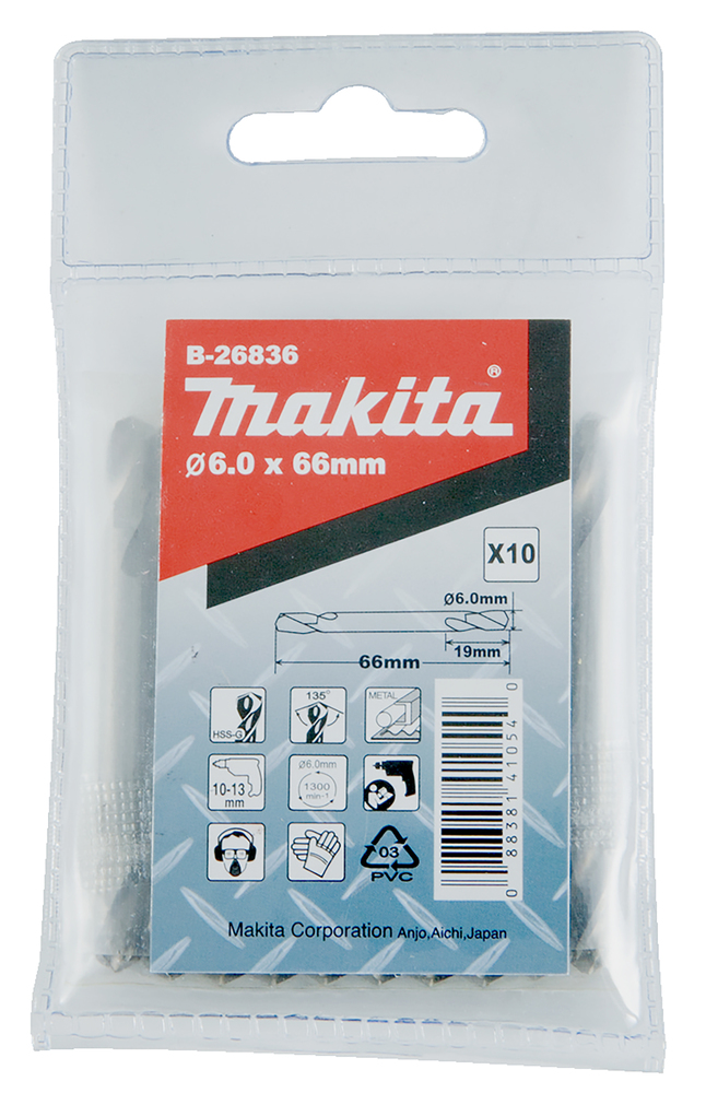 HSS Metall-Wendebohrer Ø 6,0 mm mit einer Gesamtlänge von 66 mm und einer Arbeitslänge von 19 mm. Hohe Schnittgeschwindigkeit und perfektes Zentrieren durch 135-Grad-Kreuzschliff. Die Verpackung enthält 10 Bohrer.