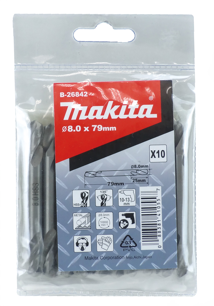HSS Metall-Wendebohrer Ø 8,0 mm mit einer Gesamtlänge von 79 mm und einer Arbeitslänge von 25 mm. Hohe Schnittgeschwindigkeit und perfektes Zentrieren durch 135-Grad-Kreuzschliff. Die Verpackung enthält 10 Bohrer.