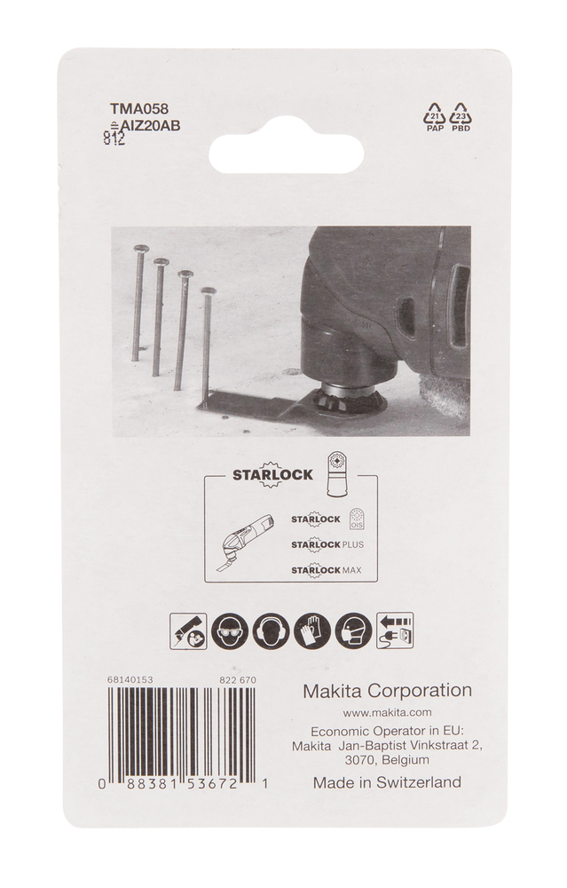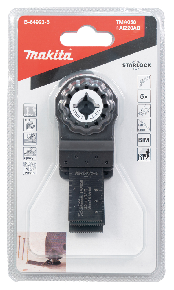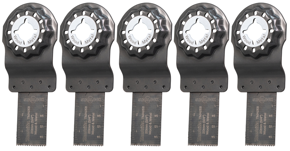 5x Tauchsägeblatt TMA058 mit einem 20 mm breiten und 30 mm tiefen Schneidblatt und einer besonders langen Lebensdauer. Die Tauchsägeblätter sind für präzise Tauchschnitte in Gipskartonplatten oder zum flächenbündigen Trennen von Nägeln oder Kupferrohren geeignet. Mit Starlock-Aufnahme für eine maximale Kraftübertragung und einen schnellen Blattwechsel.