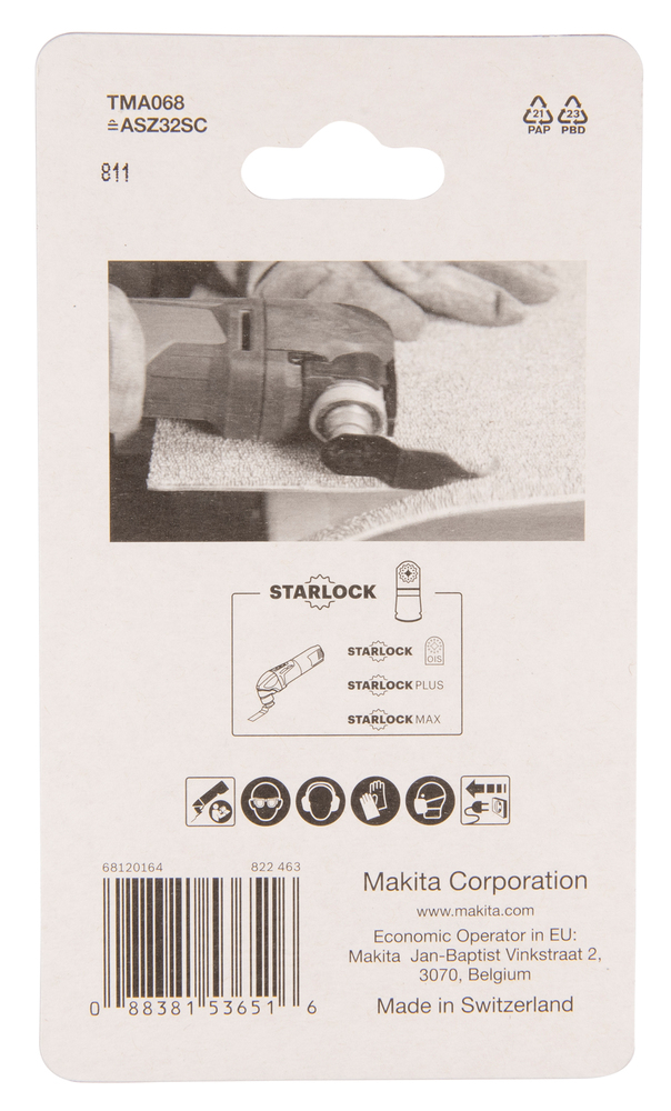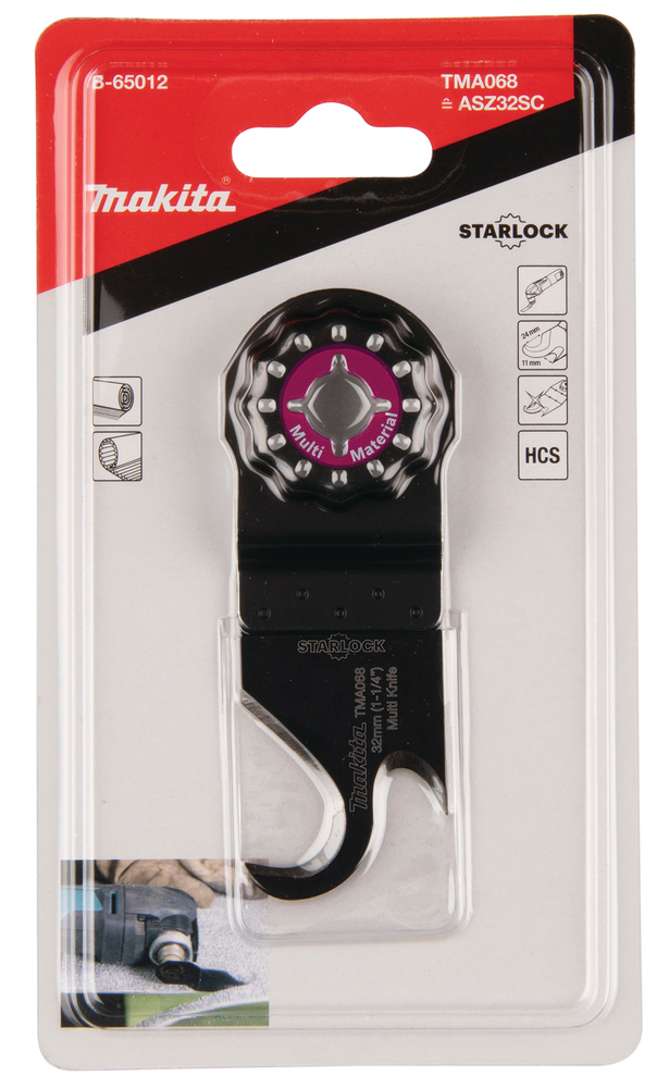 Das Universalmesser TMA068 verfügt über ein besonders geformtes Schneidblatt und ist zum Schneiden von Teppich, Karton oder PVC-Boden geeignet. Mit Starlock-Aufnahme für eine maximale Kraftübertragung und einen schnellen Blattwechsel.