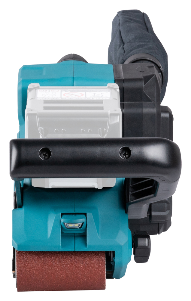Akku-Bandschleifer mit 40V max. Antrieb und einstellbarer Bandgeschwindigkeit in 5 Stufen. Der Handgriff ist werkzeuglos verstellbar (-30° - 60°), um immer die beste Arbeitsposition zu finden. Zur Ausleuchtung des Arbeitsbereichs ist eine leuchtstarke LED verbaut. Die Absaugung erfolgt in den mitgelieferten Staubsack oder über einen über Bluetooth gekoppelten AWS-Staubsauger.