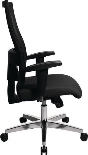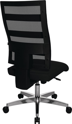 mit Punkt-Synchron-Technik (ohne Armlehnen) · für überwiegend sitzende Tätigkeiten · Aluminiumfußkreuz poliert · Rückenlehne mit atmungsaktiver Netzbespannung schwarz, Rückseite mit elastischen Gummibändern, höhenverstellbar · Flachsitz mit komfortabler Knierolle · Bezug Rückenlehne 100 % Polyester, Sitzfläche 100 % Trevira CS · Sitzfläche B 480 x T 480 mm · Lehnenhöhe 600 mm · Rollen für weiche Böden