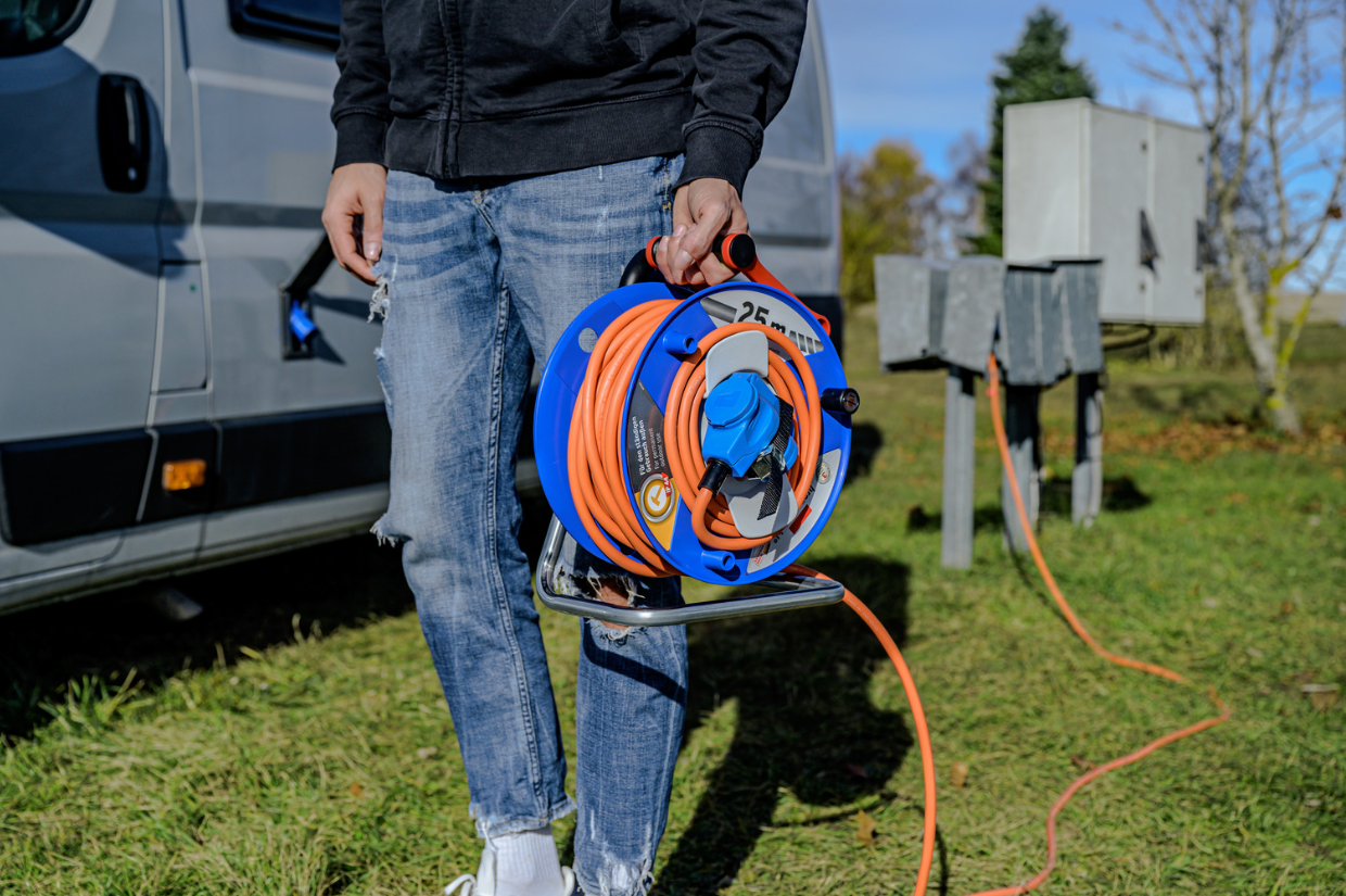 - Wohnmobil Kabeltrommel mit CEE-Winkelkupplung (230V/16A) inklusive Schutzkontakt-Kombistecker (230V) mit selbstschließendem Deckel + CEE Stecker (230V/16A) - perfekt für den Campingplatz.