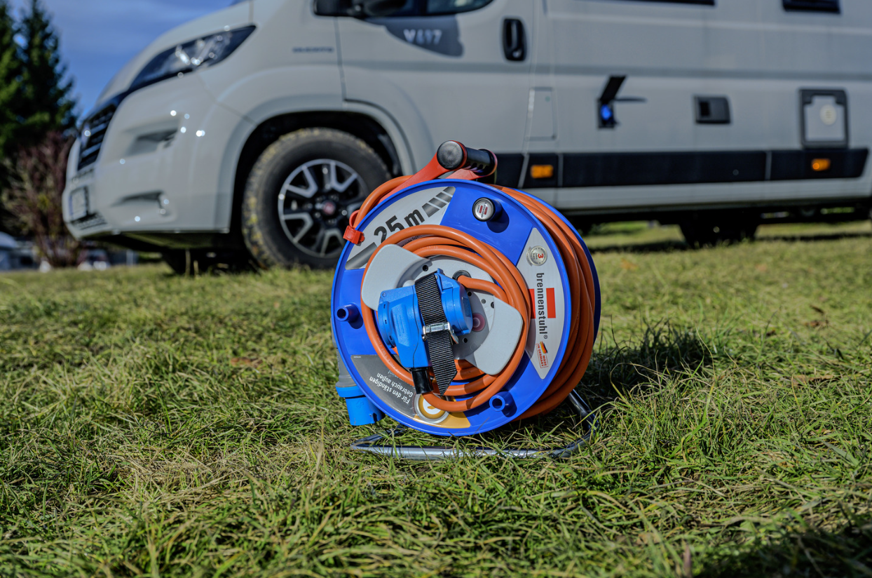 - Camping-Kabeltrommel mit 25m (23+2m) RN-Kabel (H07RN-F 3G2.5) in der Signalfarbe orange ist extrem robust, ölbeständig und für den dauerhaften Einsatz in Außenbereichen bestens geeignet.