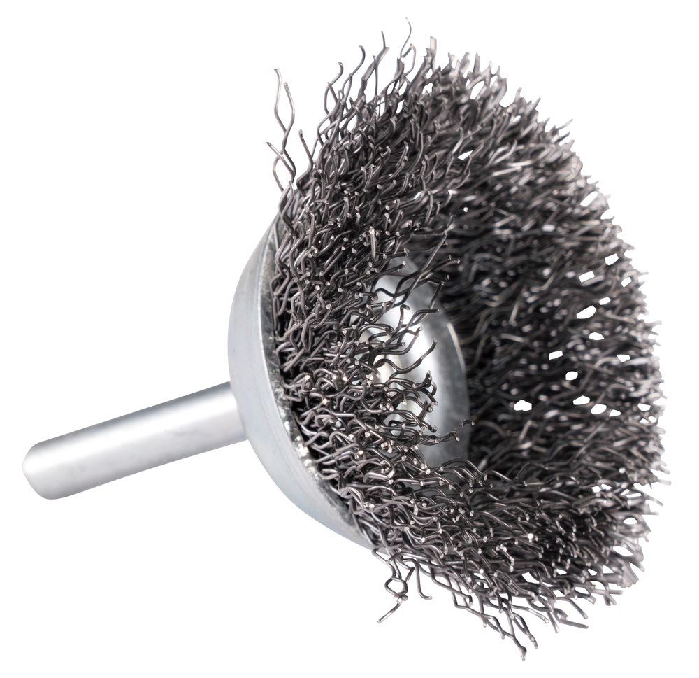 Topfbürste Ø 38 mm mit gewellten 0,3 mm starken Drahtbürsten aus verzinktem Stahl. Geeignet für eine weichere Abtragsleistung und mittelstarken Bürstenwirkung auf flachen sowie unebenen Flächen. Mit 6-mm-Rundschaft-Aufnahme.