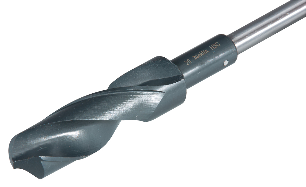 Präzisionsgeschliffener HSS-G Schalungsbohrer Ø 26,0 mm mit einer Gesamtlänge von 400 mm und einer Arbeitslänge von 100 mm. Der Bohrer hat eine Rundschaftaufnahme für Schnellspannbohrfutter. Sicherer Halt zwischen Bohrer und Schaft mittels Splint auch beim Rückwärtsausdrehen.