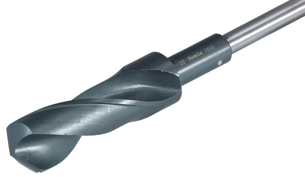 Präzisionsgeschliffener HSS-G Schalungsbohrer Ø 28,0 mm mit einer Gesamtlänge von 400 mm und einer Arbeitslänge von 100 mm. Der Bohrer hat eine Rundschaftaufnahme für Schnellspannbohrfutter. Sicherer Halt zwischen Bohrer und Schaft mittels Splint auch beim Rückwärtsausdrehen.