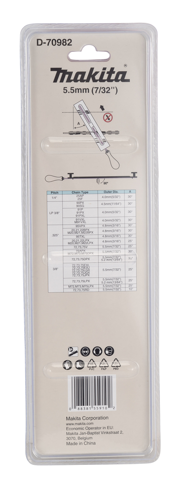 Rundfeile 5,5 mm mit weichem Feilverhalten. Zum Feilen von Sägeketten mit 3/8" Teilung und 1,6 mm Treibgliedstärke. Beispielsweise 27(A)(P), 59L/J, 68LX/JX, 72-73-75D/DX/DP/DPX/RD/JGX/JPX/LGX/LPX/V, 72AP/APX, 59AC