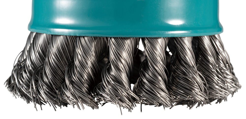 Topfbürste Ø 80 mm mit gezopften 0,35 mm starken Drahtbürsten aus verzinktem Stahl. Geeignet für hohe Abtragsleistungen mit aggressiverem und effizienterem Materialabtrag auf engem Raum. Mit X-LOCK-Aufnahme.