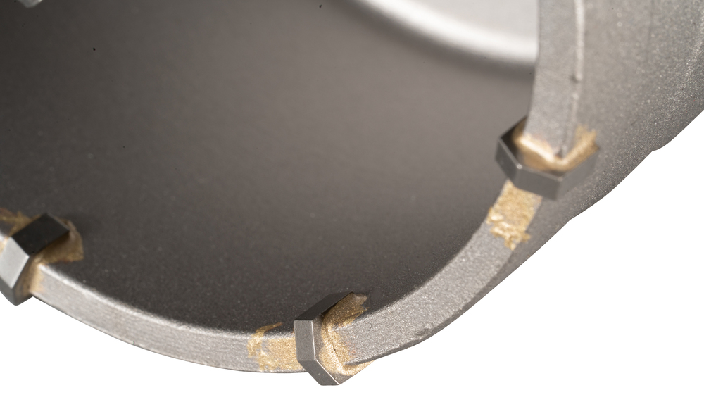 Die Bohrkrone hat einen Durchmesser von Ø 82 mm und eine effektive Arbeitslänge von 50 mm. Mit insgesamt 8 Zähnen arbeitet sich die Bohrkrone zuverlässig in das Material, angetrieben von bspw. einem SDS-PLUS-Kombi- oder Bohrhammer. Das Set wird inklusive einem 110 mm langem Aufnahmeschaft und einem Zentrierbohrer ausgeliefert.
