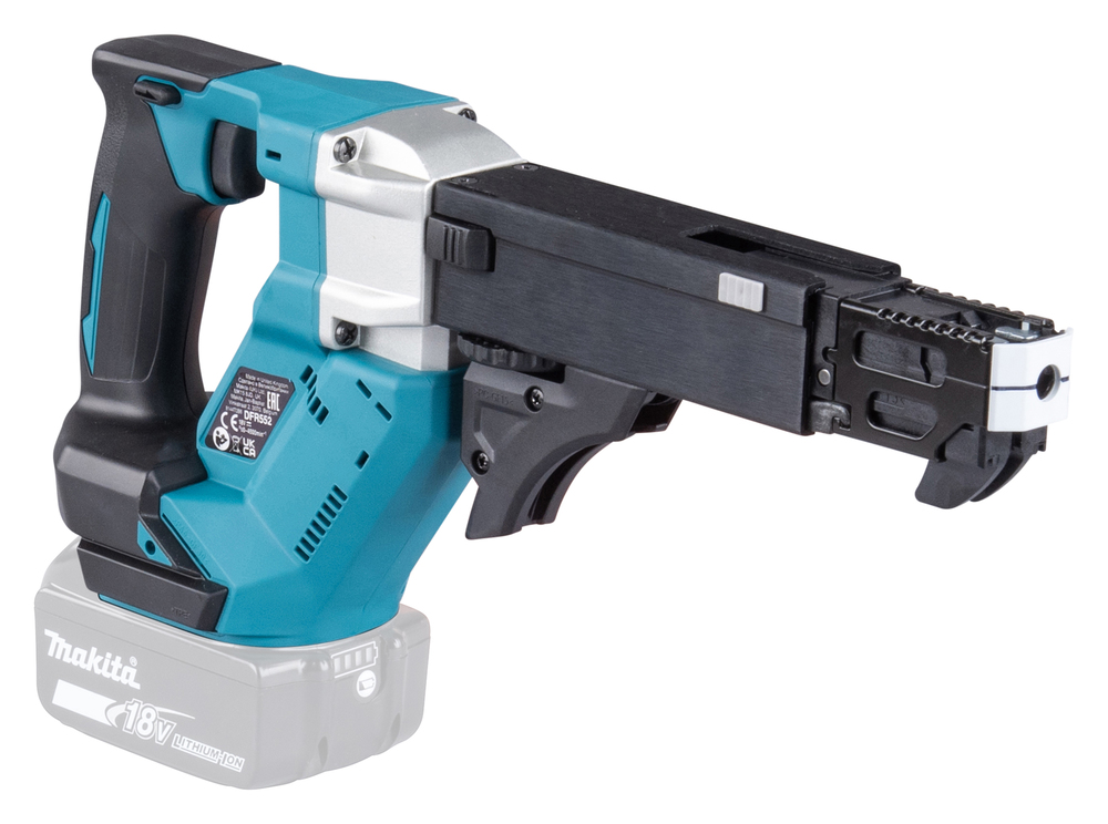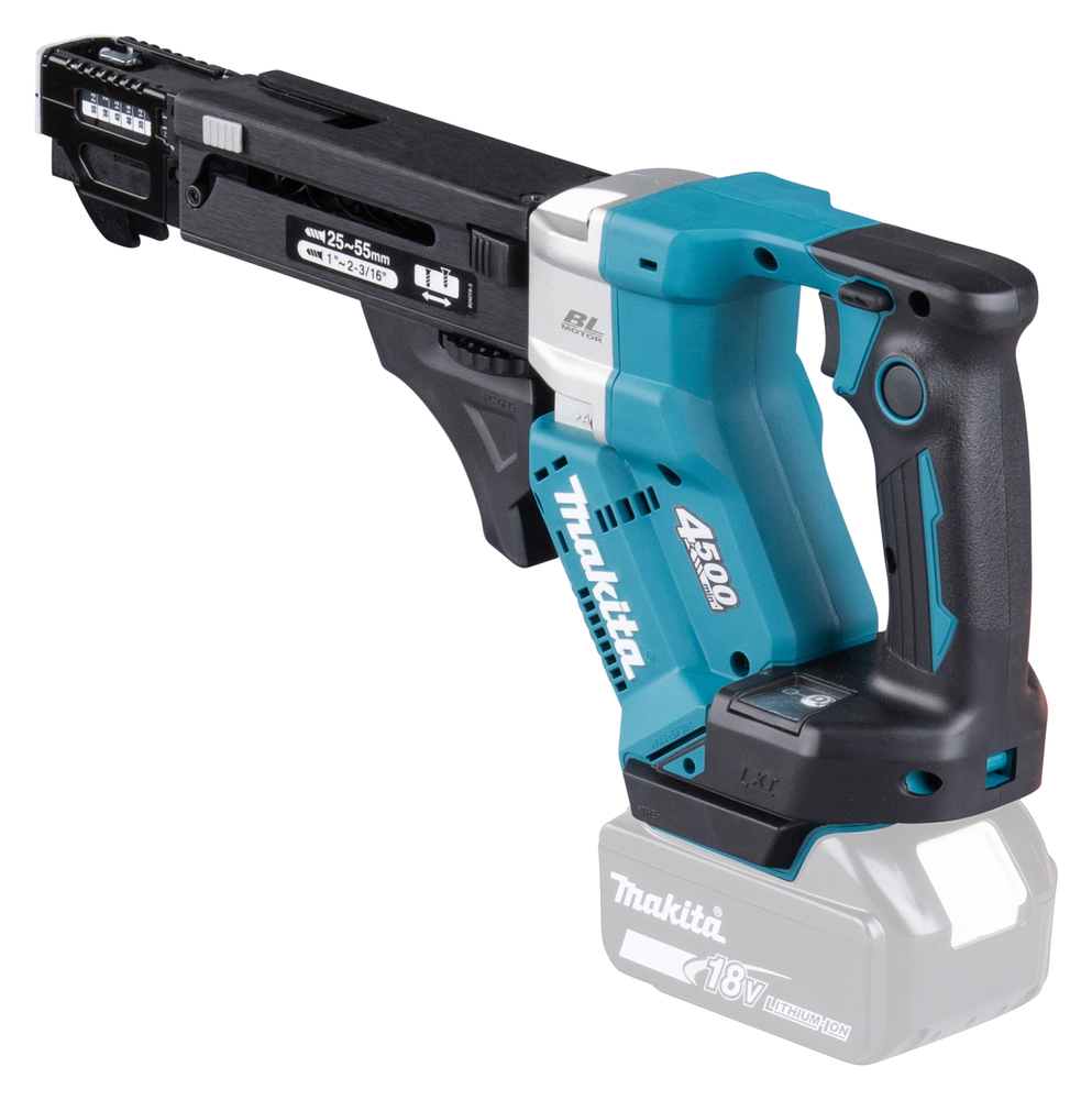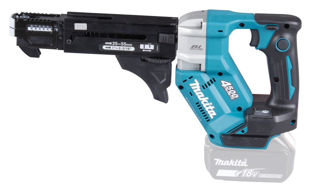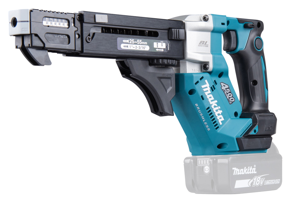 Magazinschrauber mit bürstenlosem Motor und einstellbarer Eintreibtiefe. Mit aktiviertem Push-Drive-Modus startet die Maschine automatisch durch eine Druckausübung auf den Schraubvorsatz. Dadurch wird die Leerlaufzeit minimiert und verlängert die Akku-Laufzeit. Der Akku-Magazinschrauber ist für 25 bis 55 mm Schrauben geeignet. Durch die abgesenkte Drehzahl ist ein höheres Drehmoment verfügbar für die Bearbeitung von Faserzementplatten oder Hartholz.