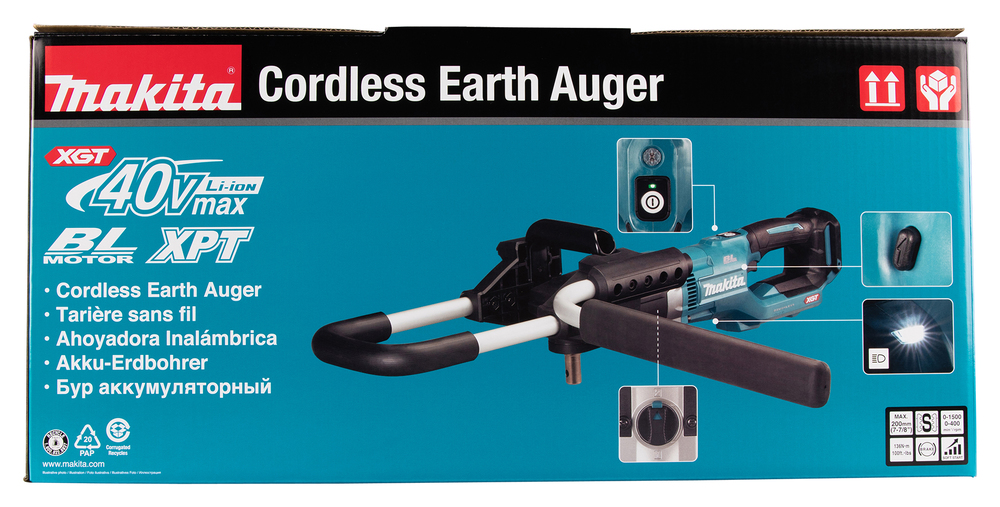 Leichter, einfach zu bedienender Akku-Erdbohrer beispielsweise für Zaunpfosten. Der bürstenlose Motor erzielt ein Drehmoment von bis zu 136 Nm. Es stehen zwei Drehzahlbereiche zur Verfügung: 0-1.500 min⁻¹ für schnelle Bohrungen in sandigen Boden oder 0-400 min⁻¹ für schweren Lehmboden. Direktaufnahme für Erdbohrer. Mit Doppel-LED.