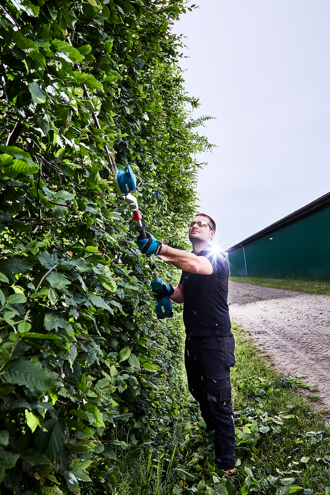 18 V Akku-Heckenschneider mit neuartiger Messergeometrie für weniger Reibung der Klingen. Mit 3 Geschwindigkeitsstufen und Rückwärtslauf bei blockiertem Messer. Die maximale Aststärke beträgt 23,5 mm. Mit bürstenlosem Motor. Mit schwenkbarem Scherblatt für waagerechten Heckenschnitt in großer Höhe.