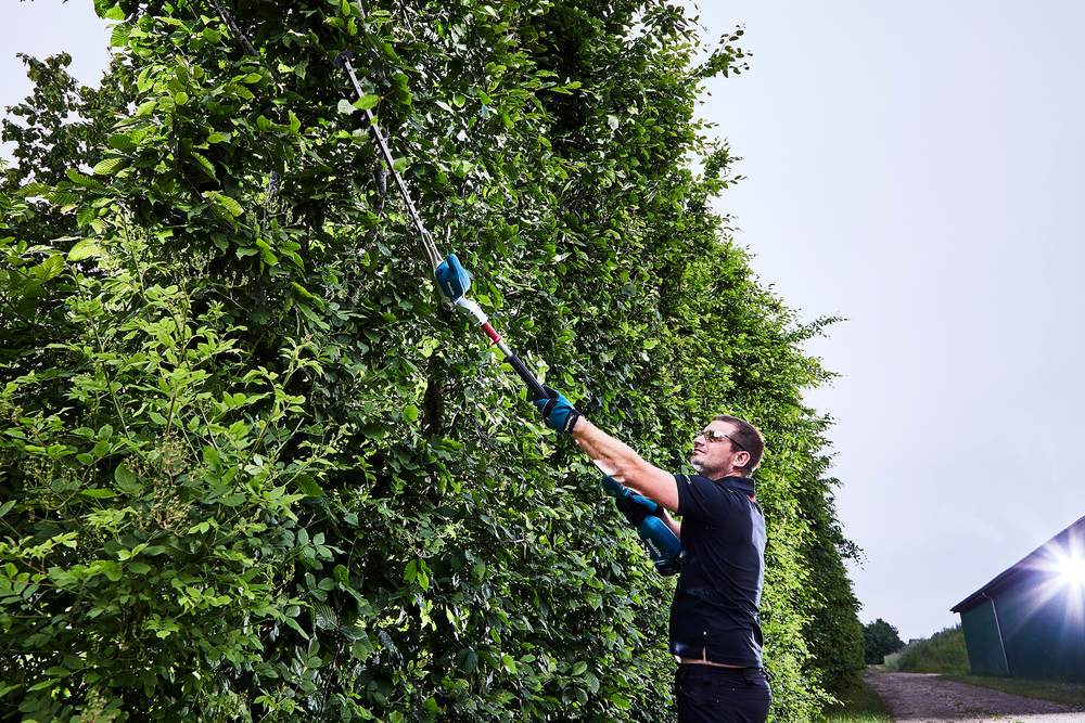 Akku-Heckenschneider mit 50 cm langem Scherblatt für hohe Hecken und große Reichweite