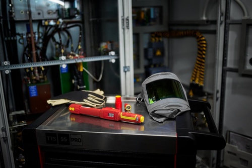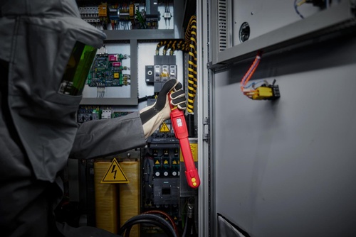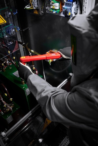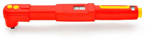 mechanisch auslösender Drehmomentschlüssel für Anwendungen unter Spannung bis 1000 V AC / 1500 V DC · schutzisoliert nach IEC 60900 · Auslösemechanismus mit Biegestab, Anzeigeabweichung ± 3 % · keine Rückstellung auf „0“ notwendig, das Messelement wird nur beim Anziehen belastet · nachjustierbar ohne Demontage und ohne erneute Isolationsprüfung · austauschbare 3/8″-Einsteckknarre (z. B. 725QR VDE) ebenfalls ohne neue Prüfung der Isolation · mit QuickRelease-Verriegelung und QuickSelect-Verstellung · Hülle aus glasfaserverstärktem Polyamid, beständig gegen Laugen, Kraftstoffe und Öle · Doppelskala N·m/ft·lb bzw. N·m/in·lb