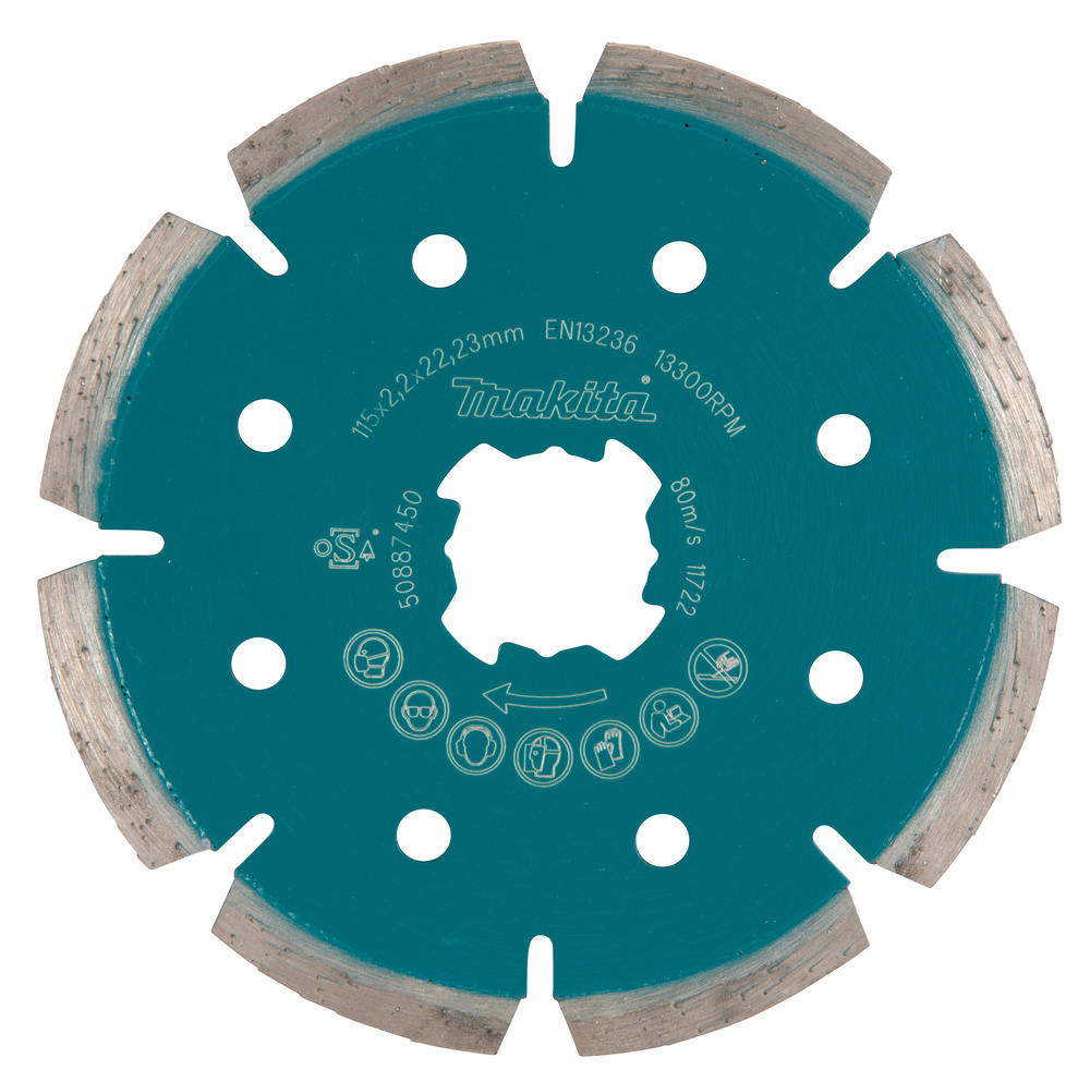 Diamantscheibe für Winkelschleifer mit X-LOCK-Aufnahme. Zum Schneiden von Beton, Granit und Marmor. 115 mm Durchmesser. Diamantscheiben von Makita erfüllen alle relevanten Sicherheitsanforderungen wie beispielsweise EN13236.