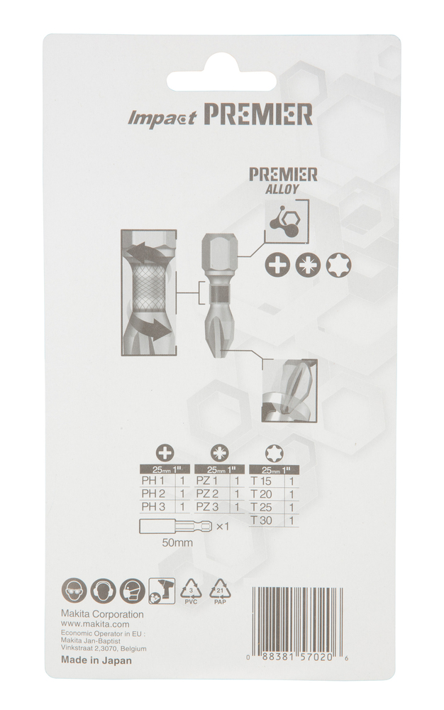 Das Makita Bit-Set ist speziell für Schlagschrauber entwickelt und enthält 10 Bits des Impact Premier Bit-Sortiments: PH1, PH2, PH3, PZ1, PZ2, PZ3, T15, T20, T25 und T30. Die Bits eignen sich dank einem verlängerten Torsions-Bereich für härteste Bedingungen und Anwendungsbereiche. Zur einfachen Erkennung der Bitform sind die Bits farbcodiert. Die Bits befinden sich in einer handlichen Kassette.