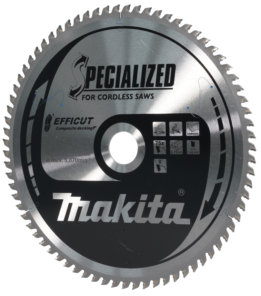 Das EFFICUT-Sägeblatt ist speziell zum Sägen von WPC (naturfaserverstärkter Kunststoff) entwickelt worden. Durch den idealen Zahnwinkel von 8° und einer Karbidspitze ist das Sägeblatt besonders Verschleißfest. Die spezielle EFFICUT-Zahngeometrie und die geringe Blattstärke von nur 1,65 mm lässt das WPC ausrissfrei und schnell sägen.