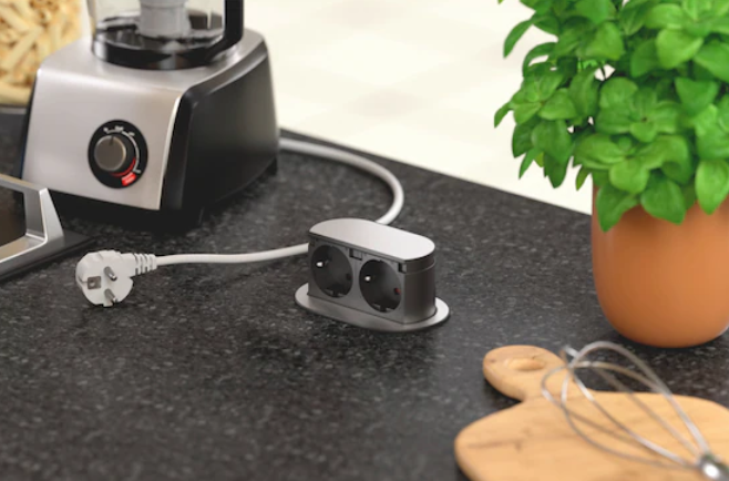 Kleine, kompakte und spritzwassergeschützte Einbausteckdose für die Küchenarbeitsplatte, den Schreibtisch oder das Sideboard